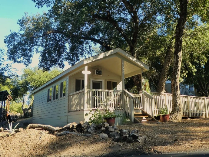 Zachai Cottage features a cozy 400 square foot open studio floor plan and an 88 square foot covered deck. It has a beautiful Kimball piano, day bed & trundle, writing desk, kitchen with 2-burner stove top and a microwave/convection oven. ADA Accessible. More about Zachai Cottage.